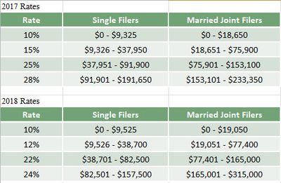 Another significant change in the 2018 tax reform is an increase to the standard deduction. For married filing jointly, the standard deduction has increased from $12,700 to $24,000 and for single filers it has changed from $6,350 to $12,000. Those who do not currently itemize will benefit significantly (only about 30% of taxpayers itemize). Those who do itemize will not be harmed. Remember, if you have more deductions to claim than the standard, you can still claim those that exceed the standard, but you automatically get the entire standard deduction. The additional deduction in current tax law for those who are blind or over 65 still applies, so a married couple with both people over 65 or blind will get an additional deduction of $2600 ($1300 each) or $1600 for a single person, which are the same as 2017 limits adjusted for inflation.